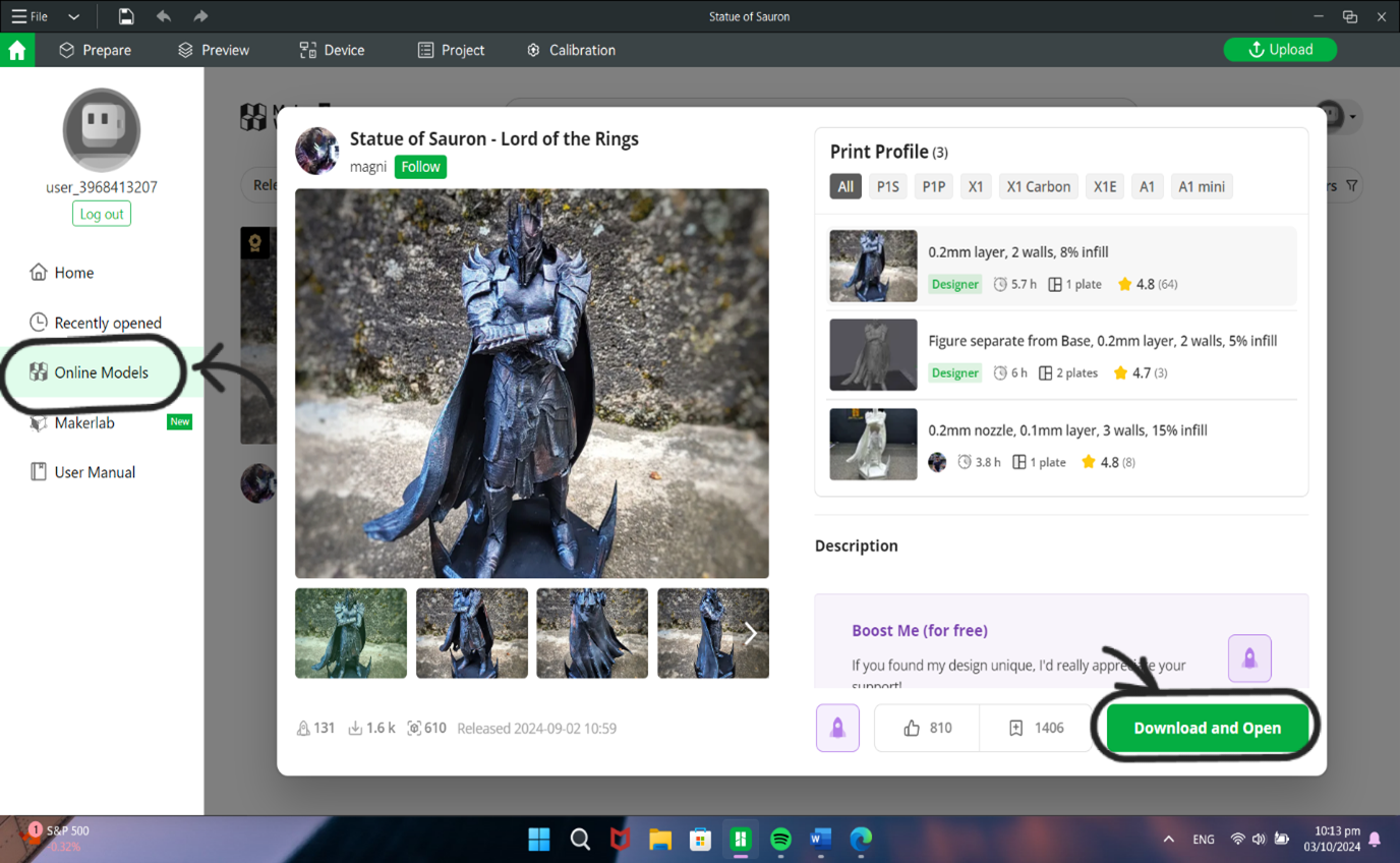 For Babmu studio, all you have to do is find the model you want, click download and open, and it will automatically transfer the model to the printing area