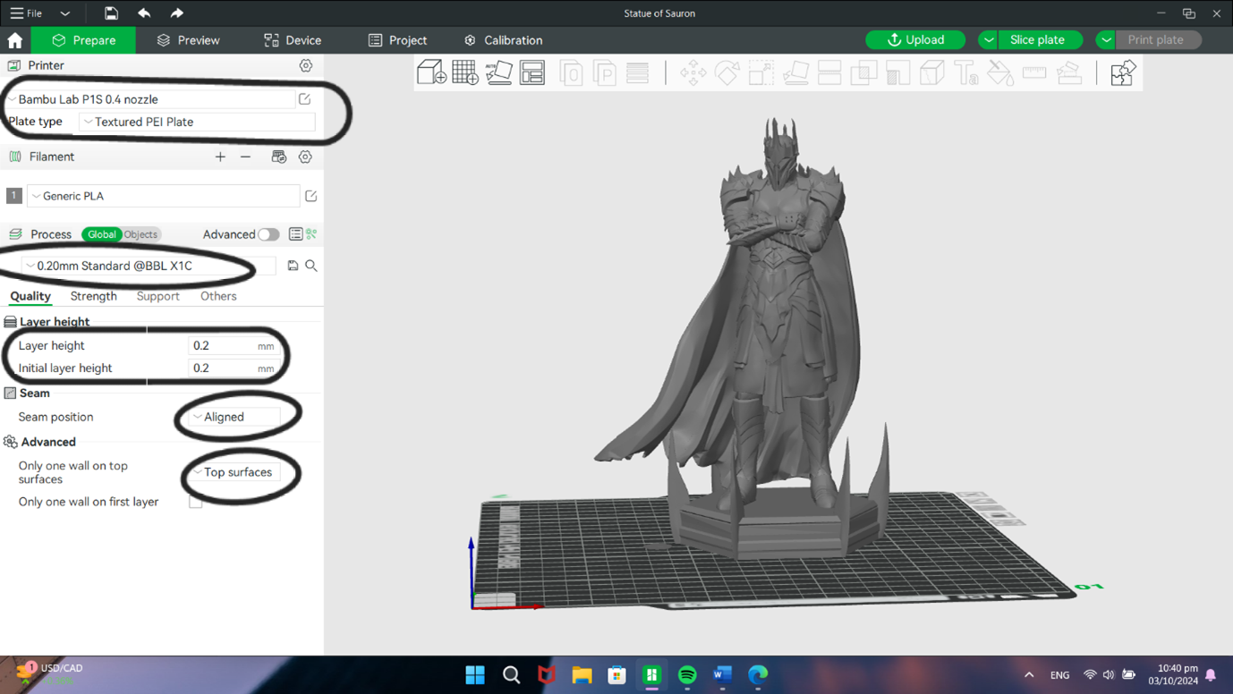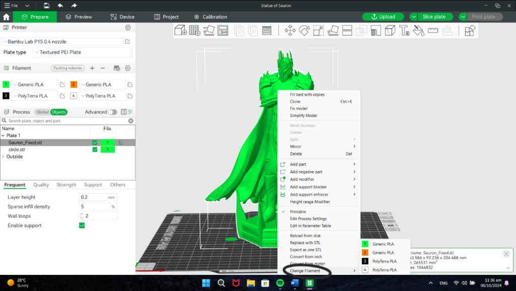 In order to change the filament (color) on the figurine, right-click on the figurine and select ‘Change Filament. And then to print,press the print plate