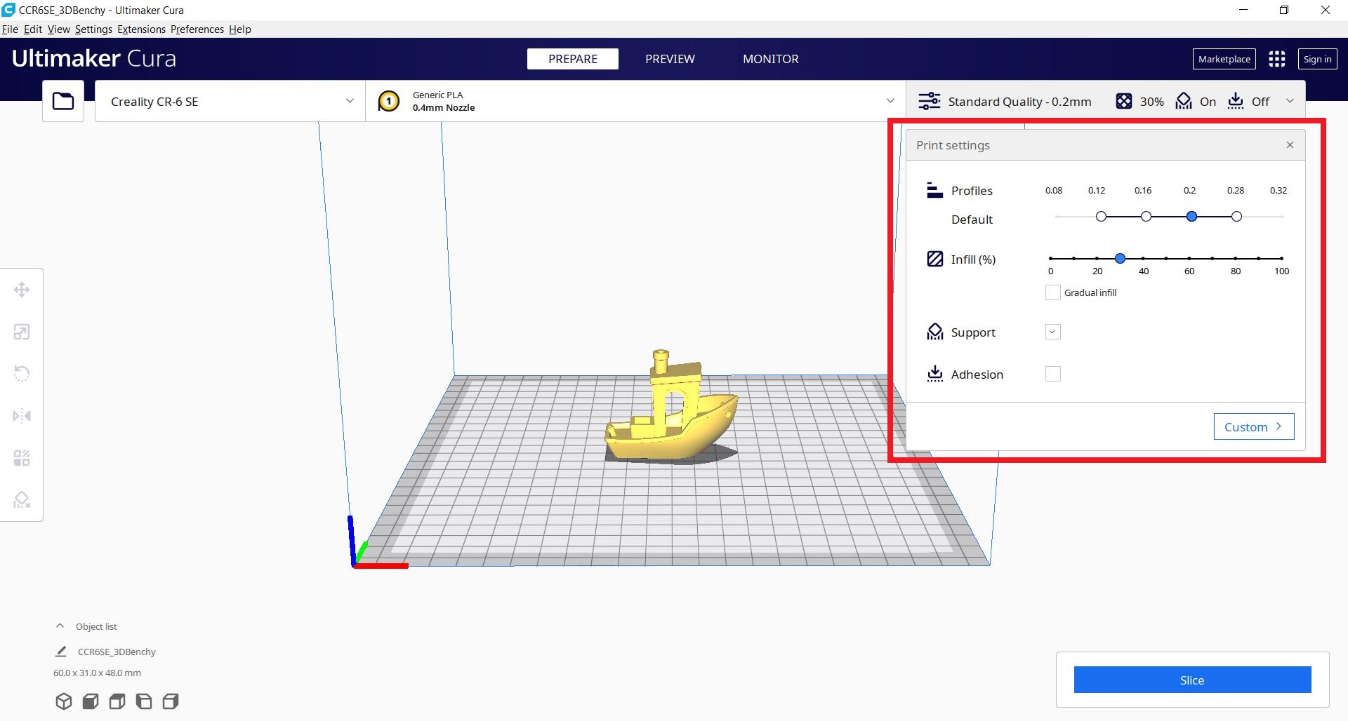 Make the necessary settings, if needed (Infill, Support, etc.).