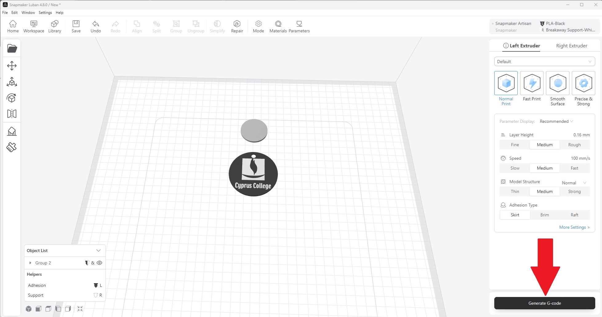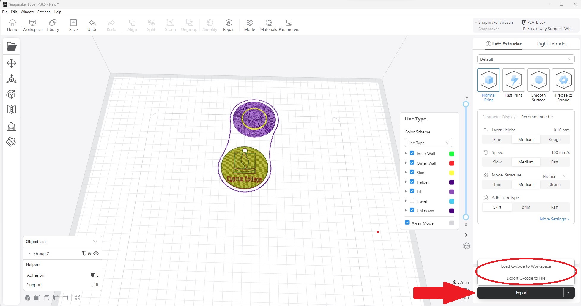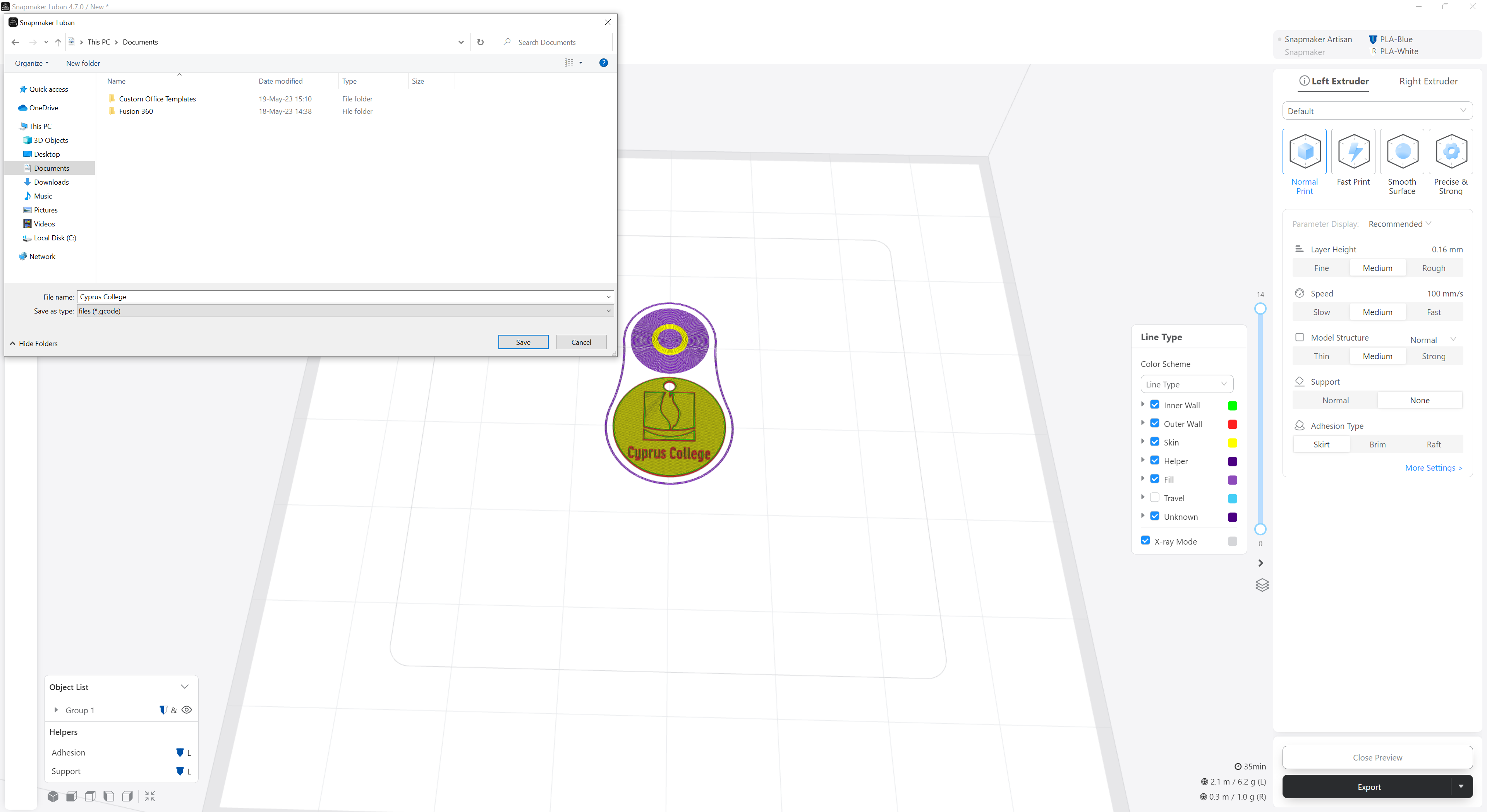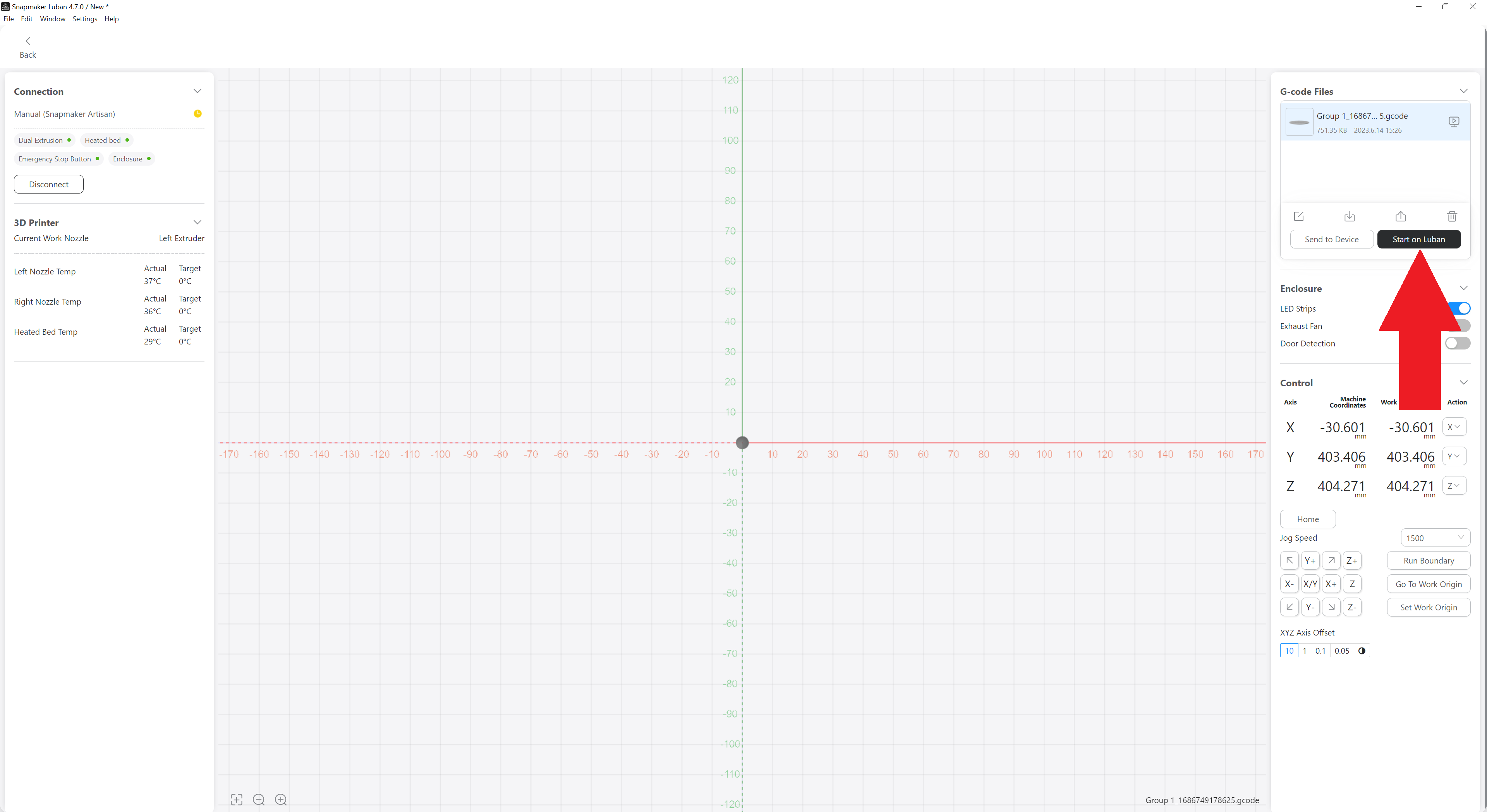 - Export G-code to file: This will create a file which will contain the G-code. You will save this file to the USB Stick and manually put it in the Artisan Controller for printing.