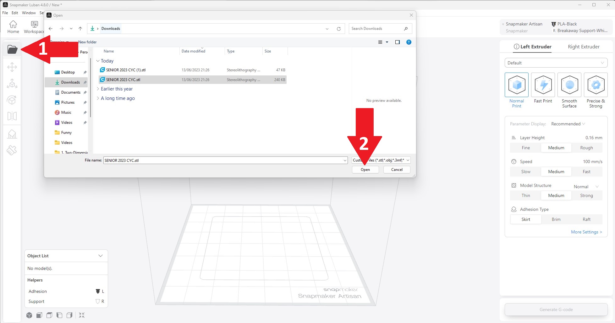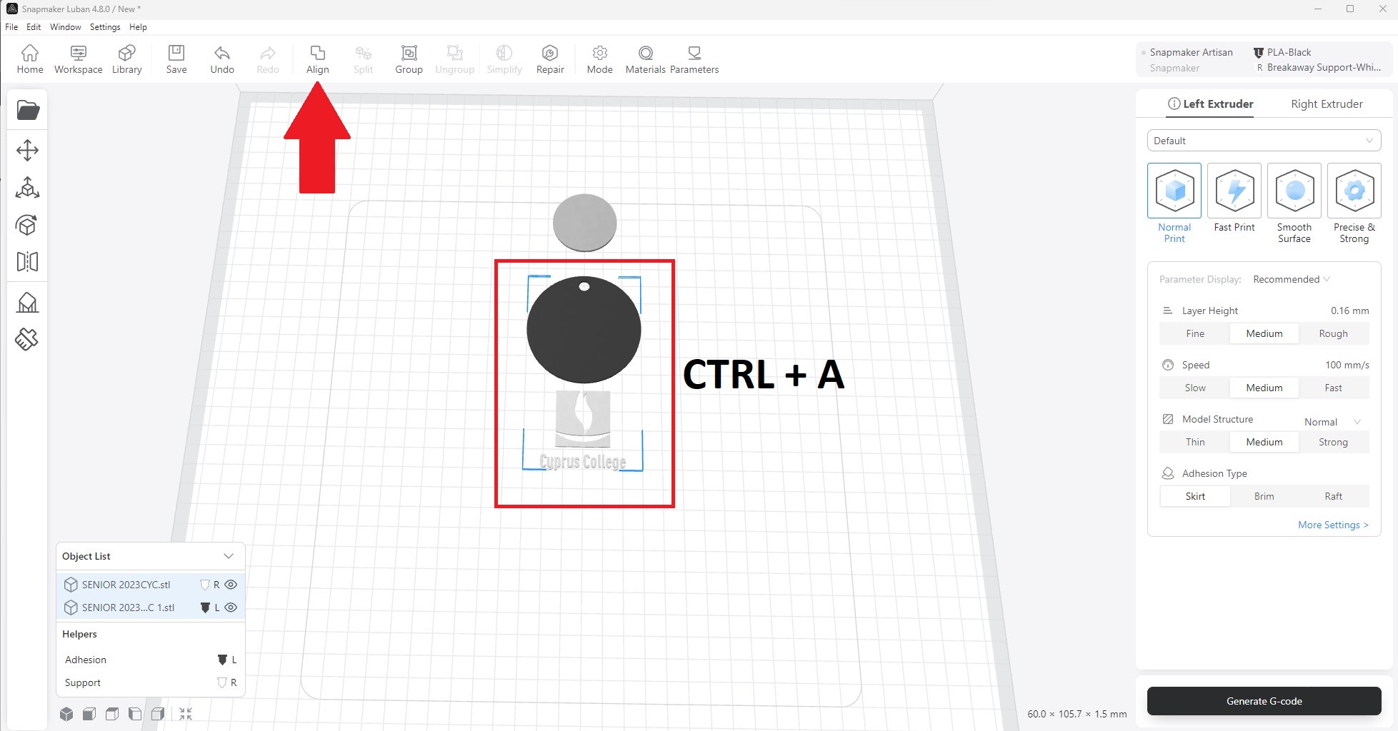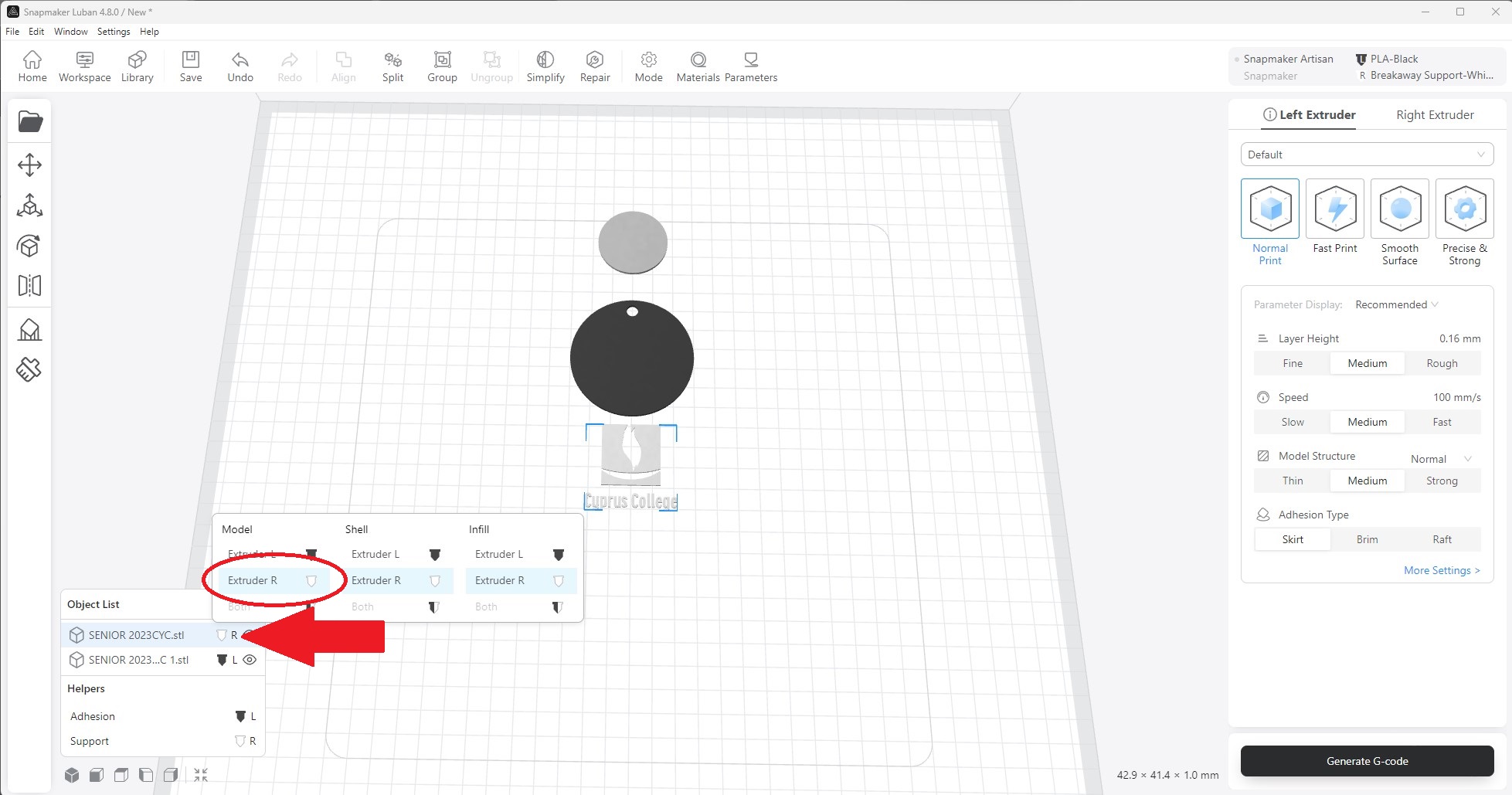 - If you have two models and you want to print each one with a different color, then choose for each model which nozzle you want it to print from (there are 2 nozzles, Left and Right, and each one prints with a different material color).