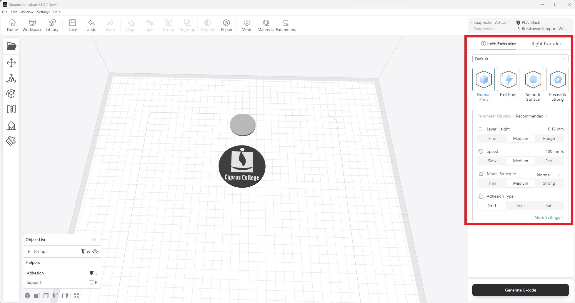 Make the necessary printing settings for each nozzle (Type of Printing, Layer Height, Speed, etc.), if needed.