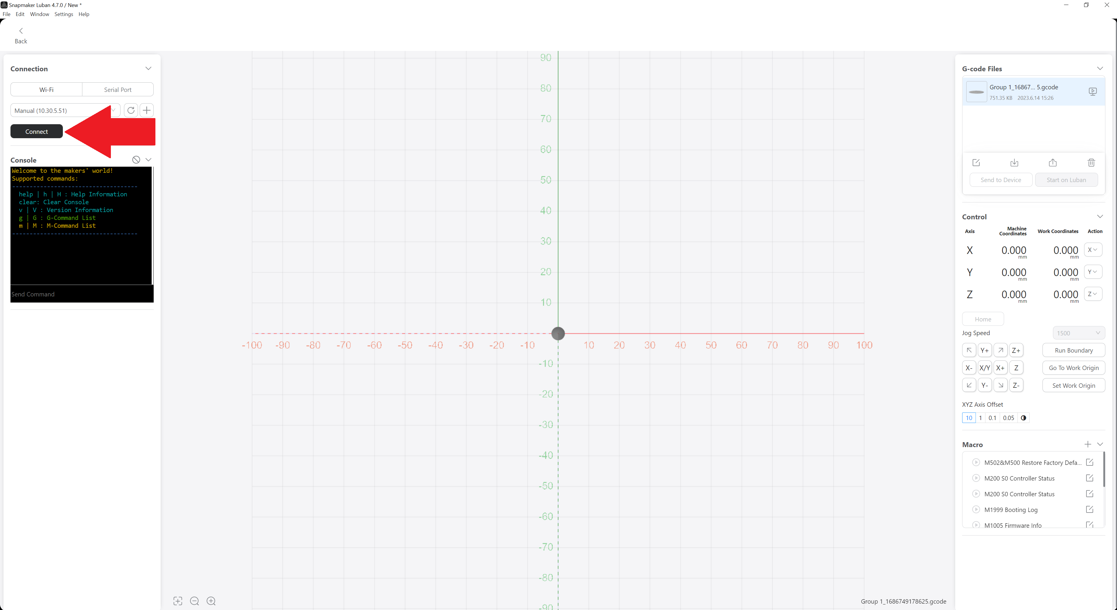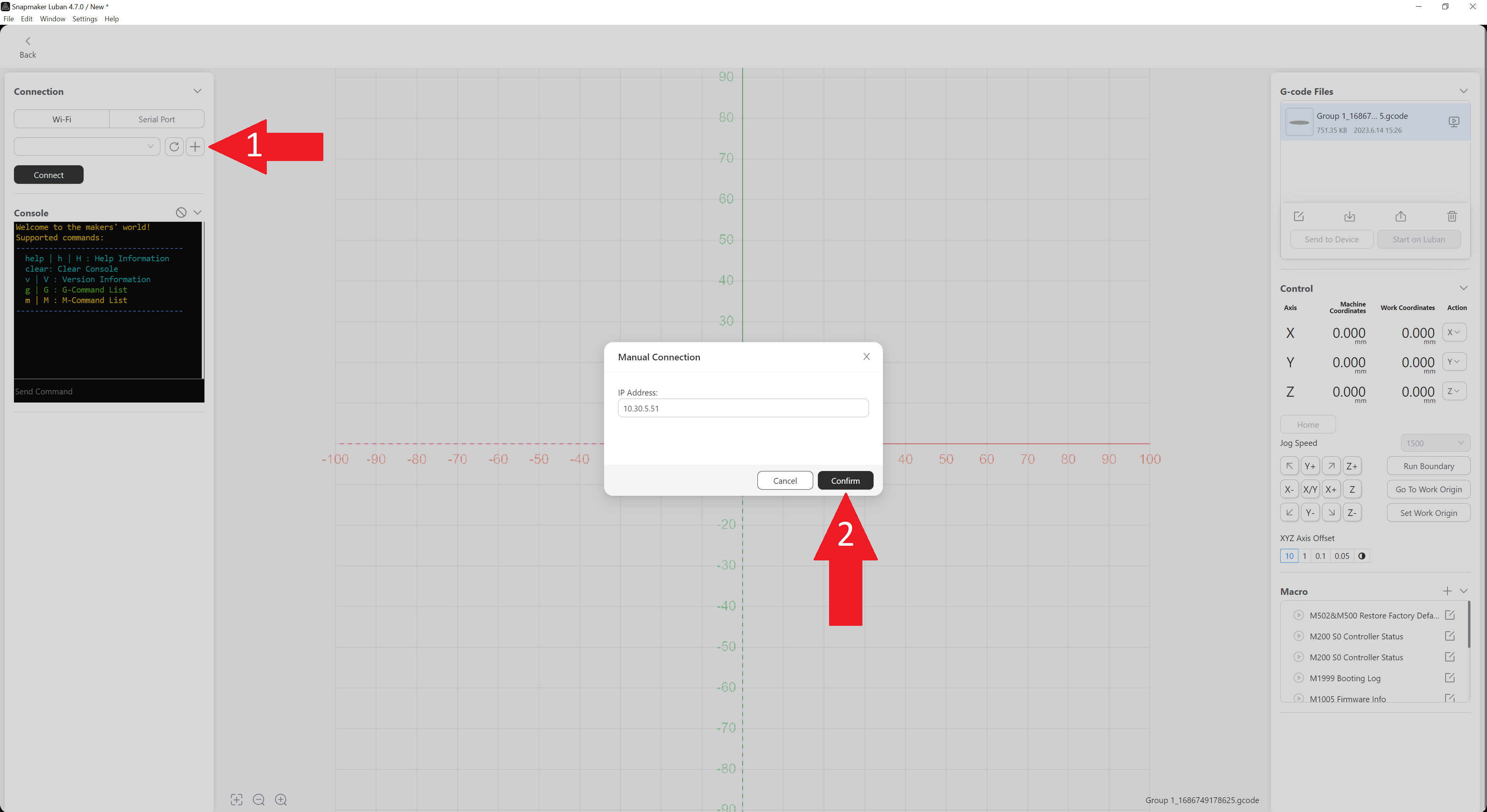 - Load G-code to Workspace: If you choose this, a window will open in which you can connect to the 3D Printer via IP address and send the file for printing.