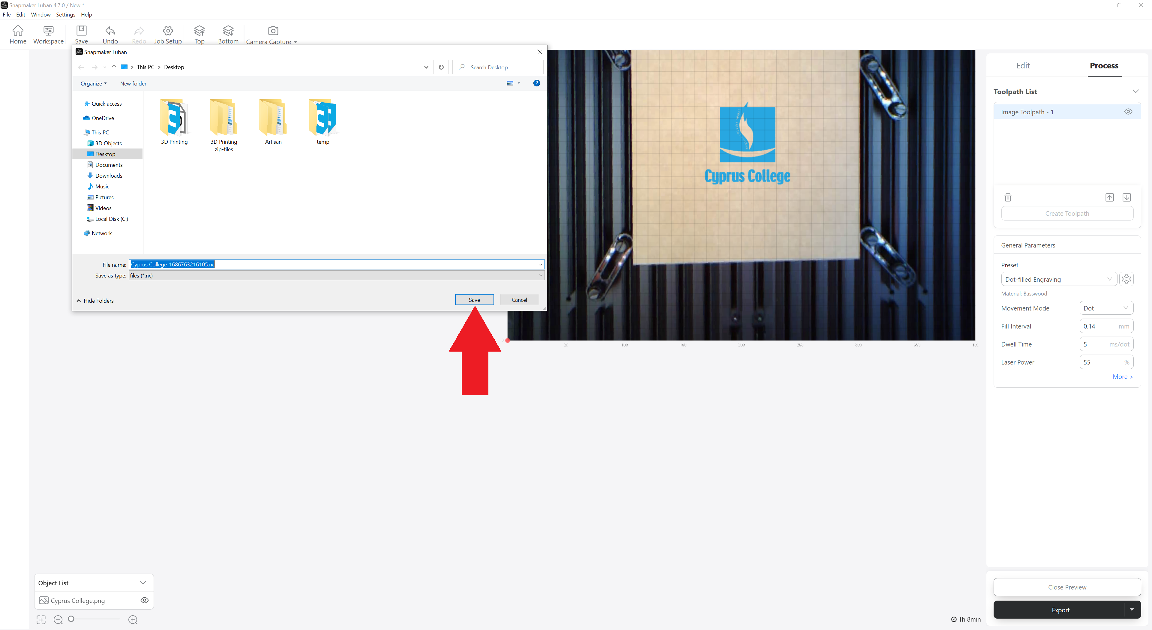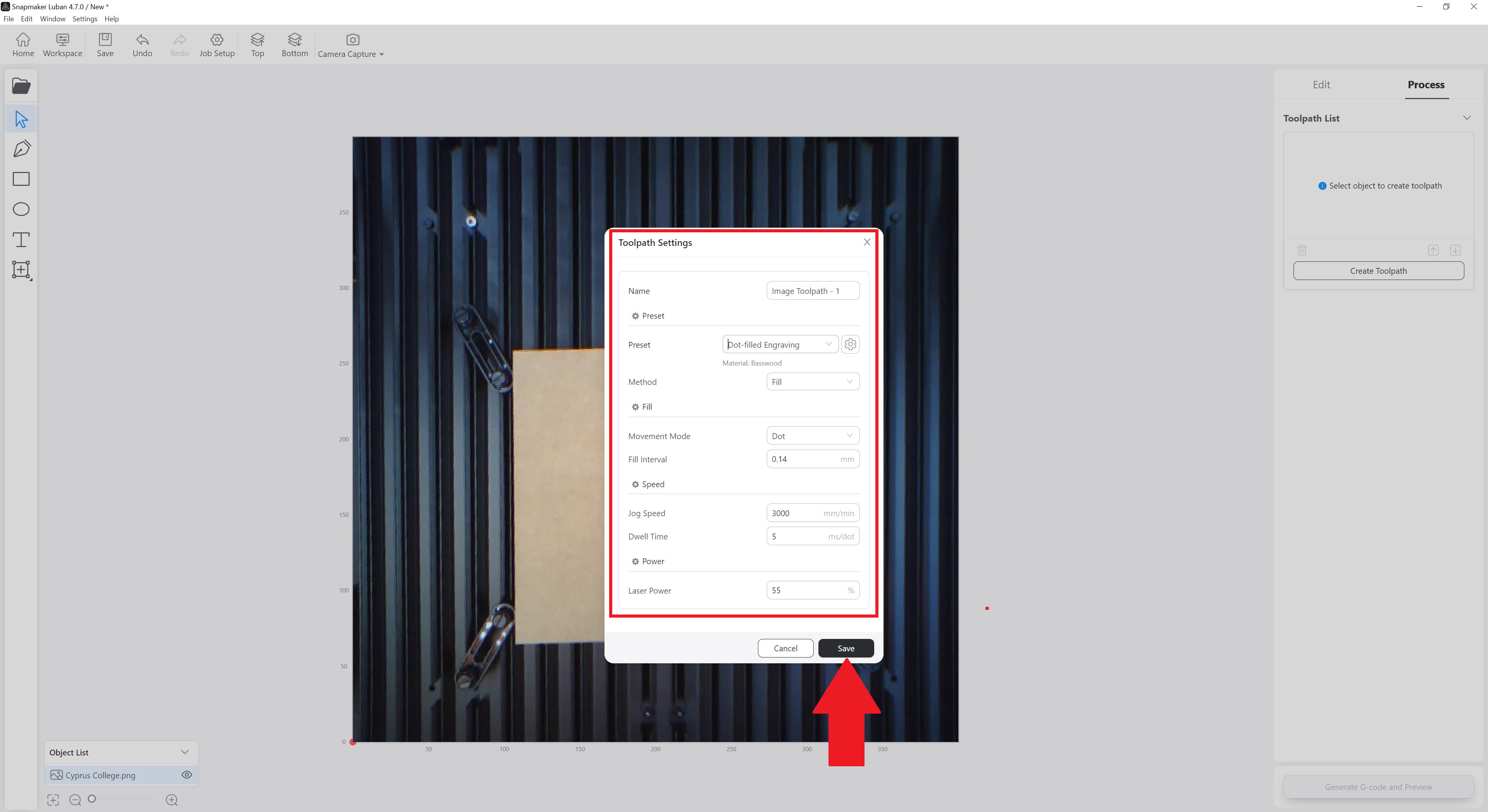 b. Make the settings you want (material you will use, if you want it to engrave with dots or lines, etc.) and click on Save.