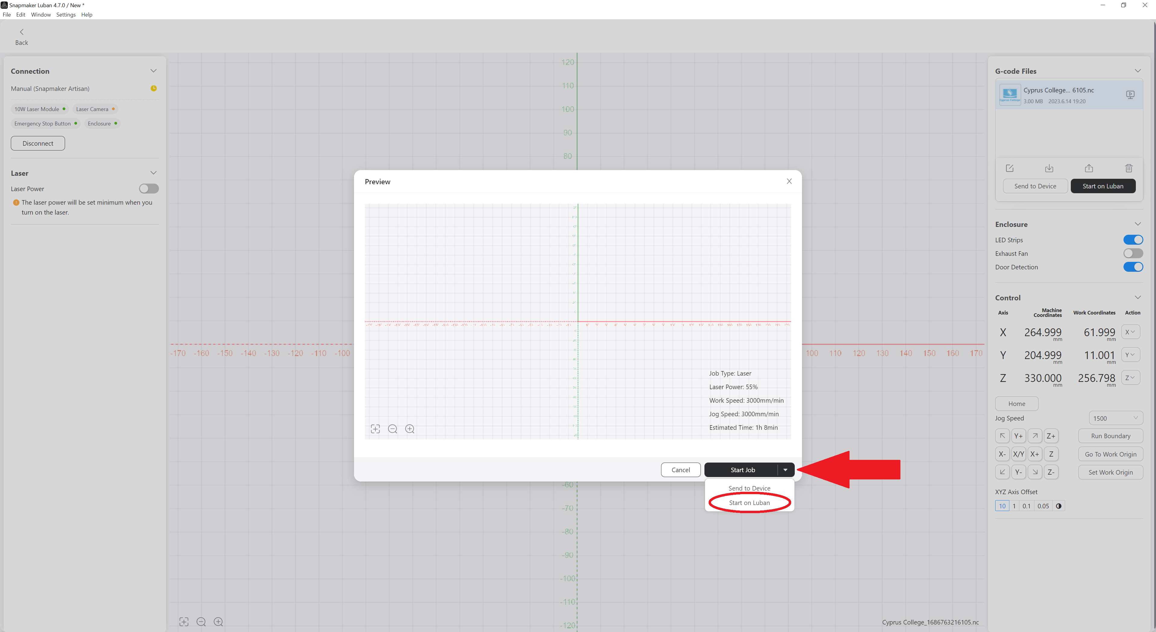 Click on Start Job and choose Start on Luban.