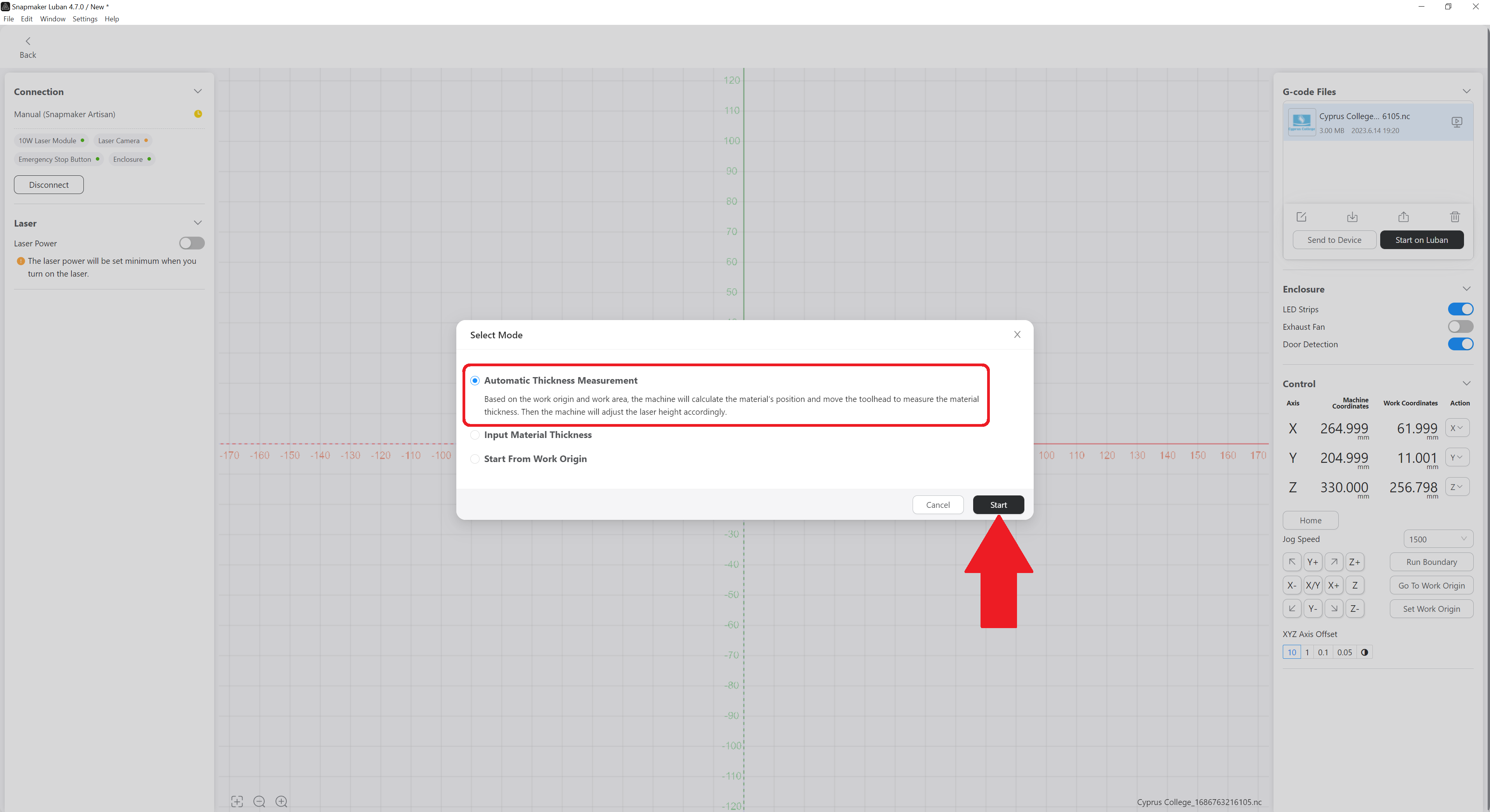 Click on Automatic Thickness Measurement, then click on Start and the engraving – cutting will start.