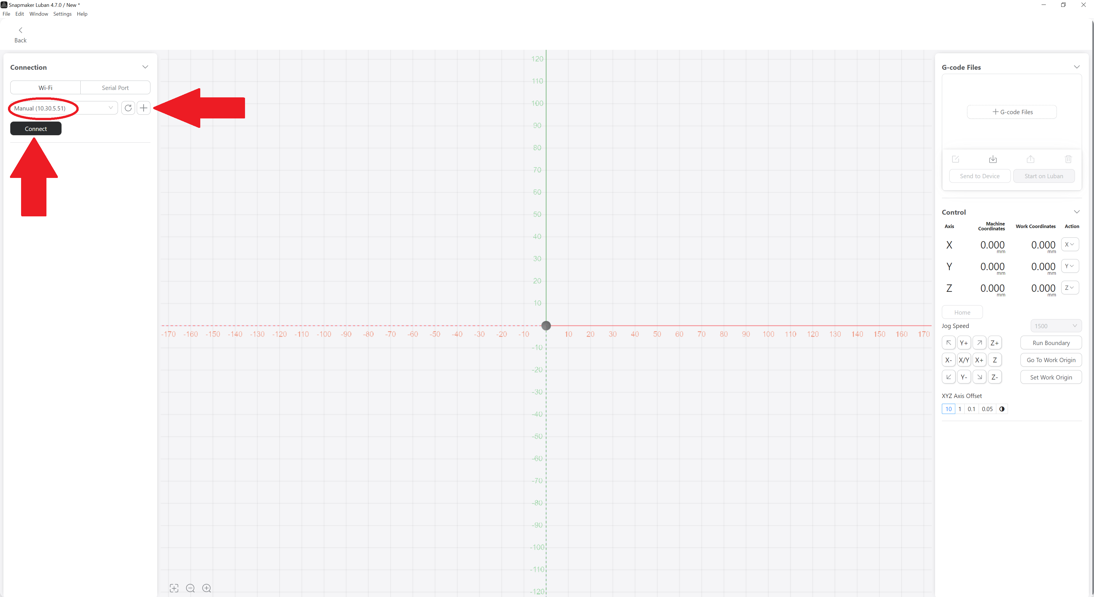 - Load G-code to Workspace: If you choose this, a window will open in which you can connect to the Artisan via IP address and send the file for engraving or cutting.
