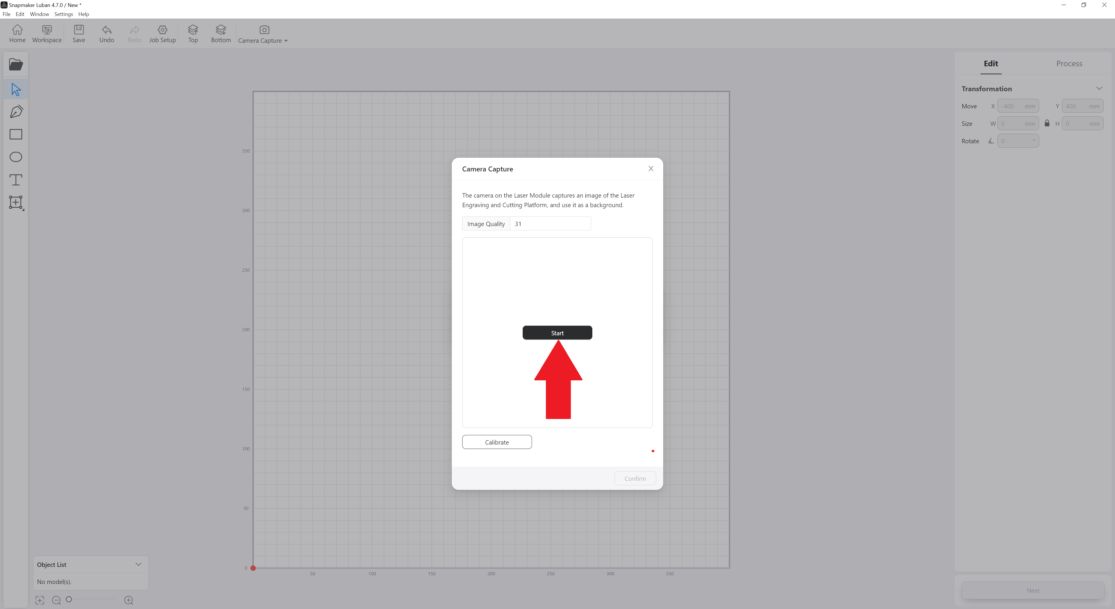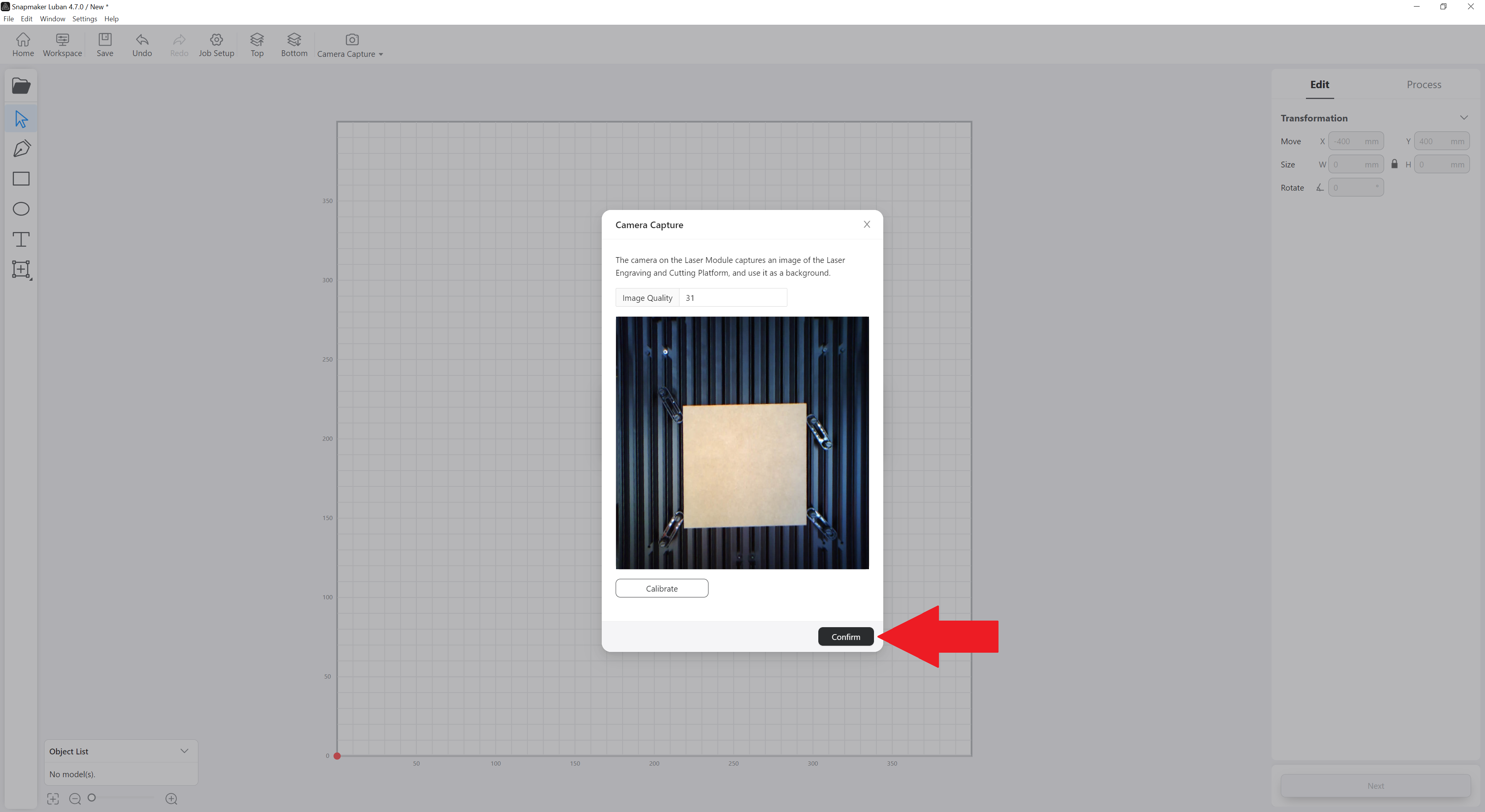 Click on Confirm if the photo is okay. If there is a problem with the photo, click on Calibrate and adjust the corners of the image.